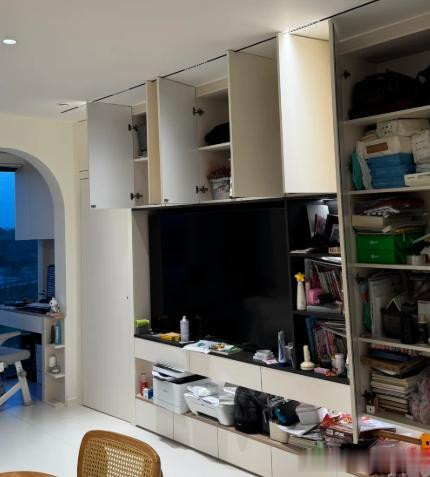 装修的时候合计满墙电视柜颜值高,还能装东西,比平常的电视配景墙合算多了。