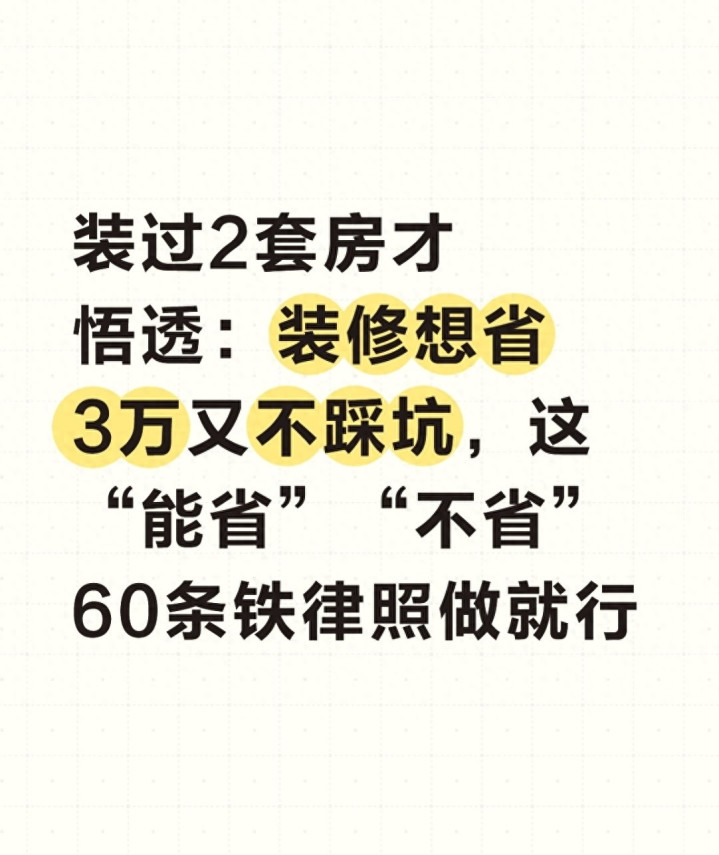 我前后装了两套屋子,第一套盲目跟风花了不少冤枉钱,第二套靠着归来的申饬,精确吝啬+守住底线,不仅省了3万多,住了三年还没出现任何问题。今天就把这两套屋子归来出的“能省”“不成省”的60条铁律,用大口语讲透,不论你是毛坯房装修,还是老房翻新,照着作念,既能省下真金白银,又能遁藏90%的装修坑。